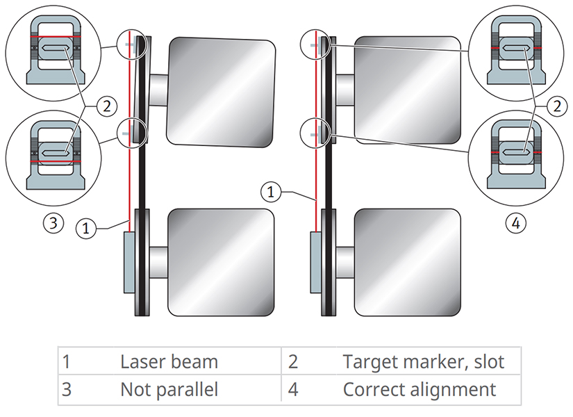 Khi bật thiết bị, một vạch laser màu đỏ xuất hiện. Điều chỉnh vị trí puly cho đến khi vạch laser đi thẳng qua khe ngắm của cả hai khối đích. Khi đó, các puly đã được căn chỉnh chính xác cả về song song và góc. Khoảng cách làm việc của thiết bị từ 40 mm đến 10 m, cho phép sử dụng cả trên hệ thống nhỏ gọn lẫn máy có kích thước lớn. Người vận hành chỉ cần một mình để hoàn thành công việc trong vài phút.